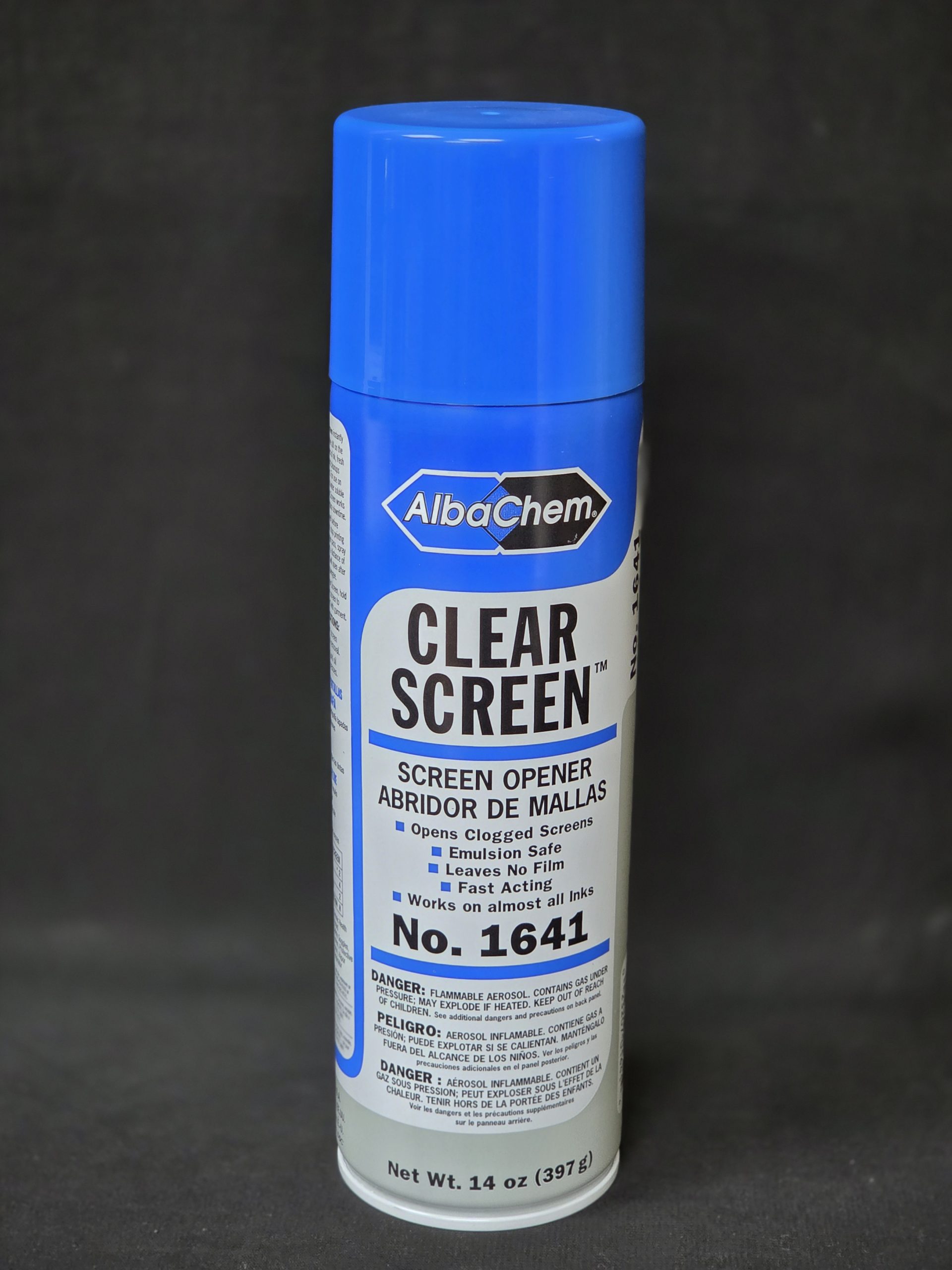 SKU: 1641AlbaChem Clear Screen is an aerosol spray designed to clear and open printing screens of dried inks and other dissolvable substances. The unique formula does not contain any water and will not soften emulsions. It is made for use on photographic stencils or water soluble hand-cut film only.